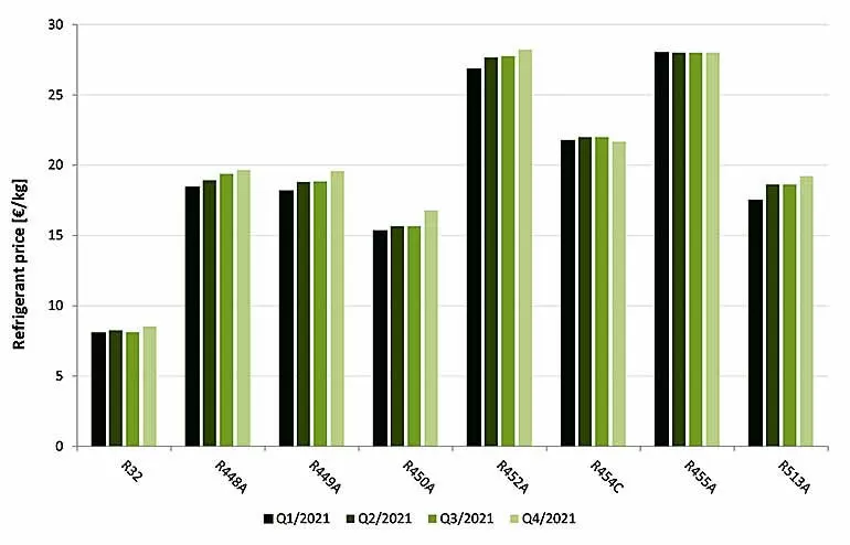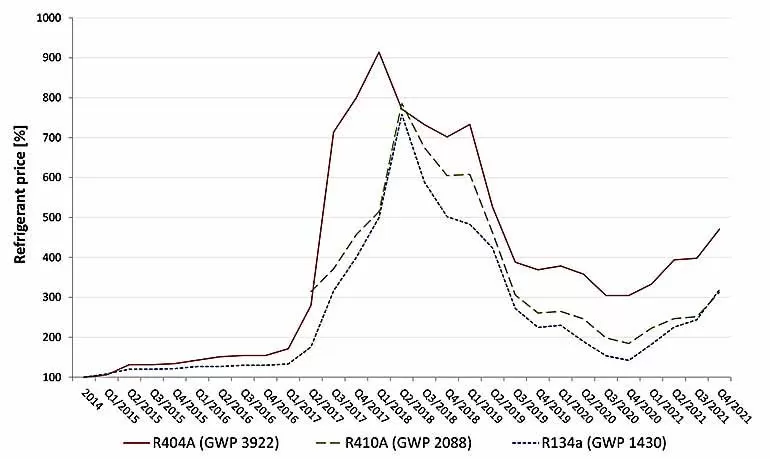 2021’de azalan kota arzının etkilerine ek olarak, artan navlun ve nakliye maliyetleri ve hammadde tedariğindeki kıtlıklar nedeniyle AB dışı tedarikçiler tarafından azalan üretim hacimleri de fiyatlarda artış olmasına neden oldu. Kademeli düşüş öncesinde, 2014 yılındaki fiyatlar ile karşılaştırma yapıldığında R134a, R404A ve R410A fiyatları tedarik zinciri seviyesine bağlı olarak 2 ila 7 kat daha yüksek olduğu, R134a iki ila üç kat daha yüksek iken, en büyük artışlar üç ila yedi kata kadar R404A için olduğu belirlendi.
