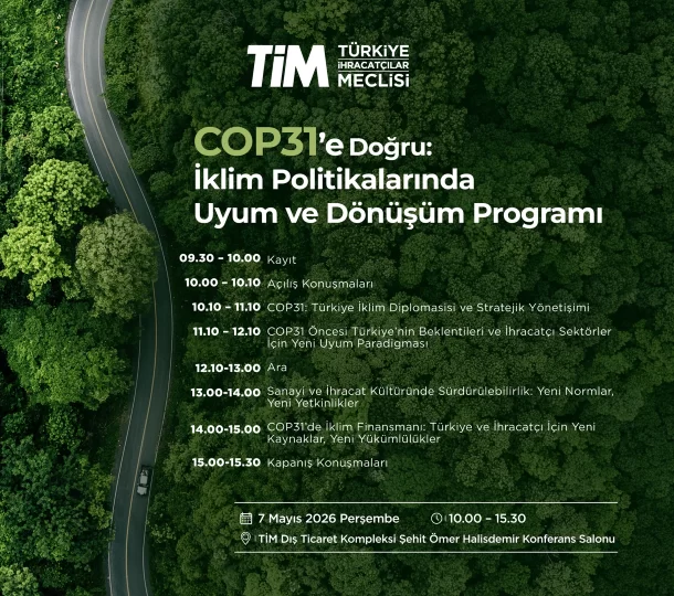 Türkiye İhracatçılar Meclisi tarafından küresel iklim gündeminde yaşanan dönüşümler doğrultusunda ihracatçılarımızın stratejik uyum kapasitesini artırmak amacıyla 7 Mayıs 2026 Perşembe günü saat 10.00’da TİM Dış Ticaret Kompleksi Konferans Salonu’nda “COP31’e Doğru: İklim Politikalarında Uyum ve Dönüşüm” programı gerçekleştirilecektir.
